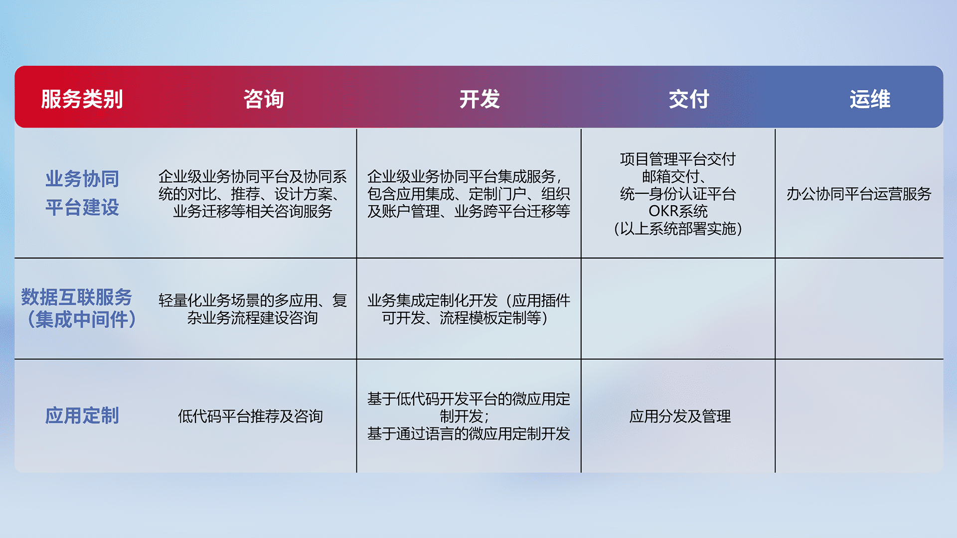 针对钉钉、、企微、、、IDaas等平台级产品提供产品的规划、、、方案、、、、交付、、定制化开发等服务,,实现如统一协同办公、、、智能客户服务、、混合会议管理、、、、智能数据查询、、、等业务场景,,实现数字化转型。。